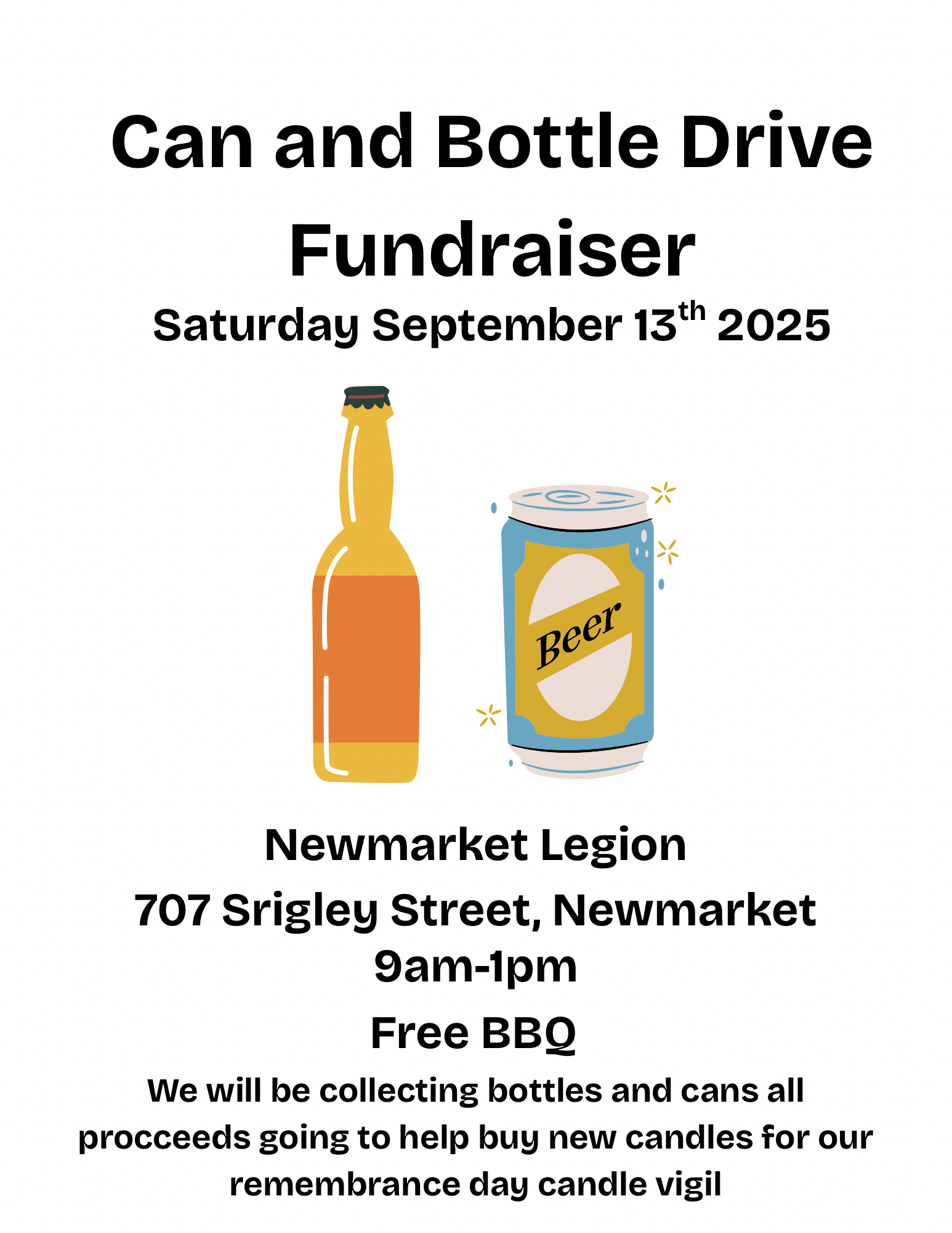 Sat Sep 13 - Can and bottle drive. 9 am - 1 pm. Free BBQ. We will be collecting bottle and cans. All proceeds going to help buy new candles for our remembrance day candle vigil. Please click here for copy of flier